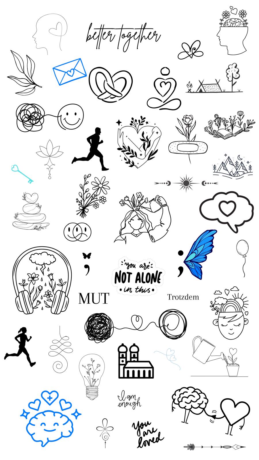 Dieses Mal haben wir sogar eine Mental Health Tattoo-Aktion von HOLA PAPAYA Tattoo Atelier dabei! Ein kleines Mental Health Tattoo für nur 80 Euro (statt 150 Euro). Tattoo-Muster 1, Tattoo-Muster 2