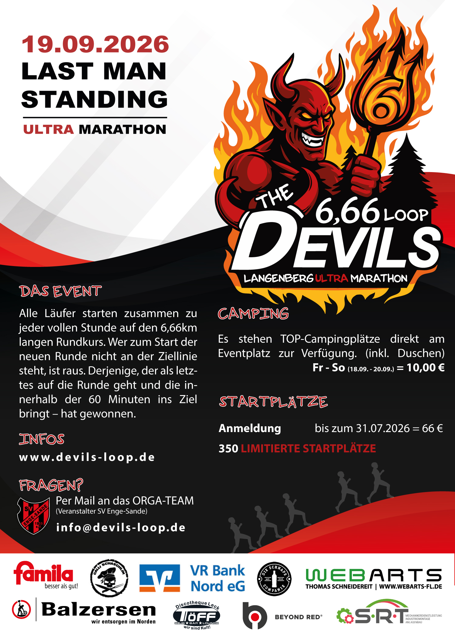 Das Event findet mitten im Langenberger Forst in Enge-Sande statt. Von dort aus geht ihr zu jeder vollen Stunde auf den DEVILS LOOP - 6,66km sind vor euch. Für einen LOOP habt ihr genau 60 Minuten Zeit - seit ihr zur vollen Stunde nicht an der Ziellinie um auf die neue Runde zu starten - seid ihr raus. Am Ende wird es einen Sieger geben "THE LAST ONE STANDING"